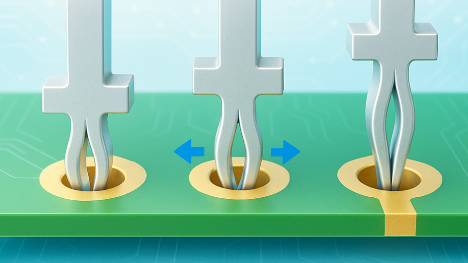 プレスフィット端子(Press-Fit Terminal)とは、はんだを使わずにプリント基板(PCB)へ圧入して電気的に接続する端子技術で、車載用高速伝送モジュールやECU、センサモジュールなどにも広く応用されています。 専用のスルーホールに圧入することで、端子... -