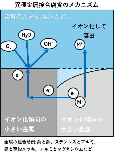 異なる金属が接触し、電解液(水分・塩分など)が存在すると電位差により微小な電池が形成されます。