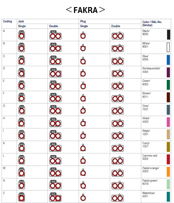 例えばFAKRAコネクタでは、A=黒、B=白、C=青、D=紫といった具合に、キー形状ごとに固有の色が割り当てられています。