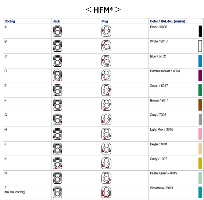 同様の考え方は、HFM®やRosenbergerHSD®、H-MTD®、MTD®など最新の車載高速通信コネクタにも受け継がれており、各規格ごとに複数のキーオプションと色が定義されています。